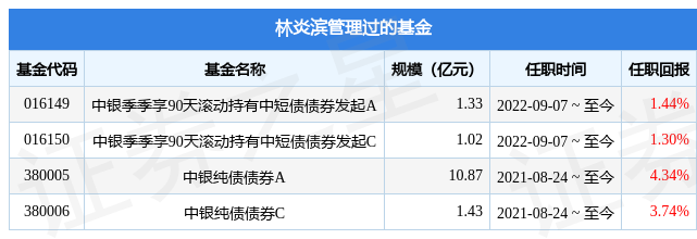 林炎滨先生:中国国籍,研究生硕士,曾任远东国际租赁有限公司信用经理。2021年8月24日起担任中银纯债债券型证券投资基金基金经理。