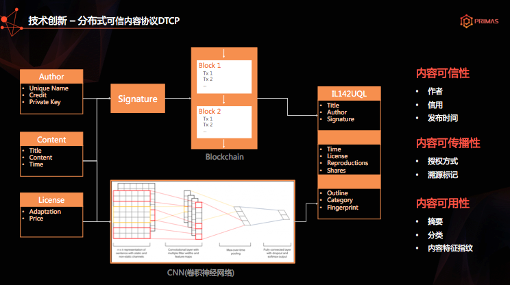 Primas就是通过区块链技术,建立一套公开的、不可篡改的DTCP协议,(DTCP: Digital Transmission Content Protection 数字传输内容保护'功能')为所有内容加上一个维度的元数据,提升互联网上内容的可信性和传播性。