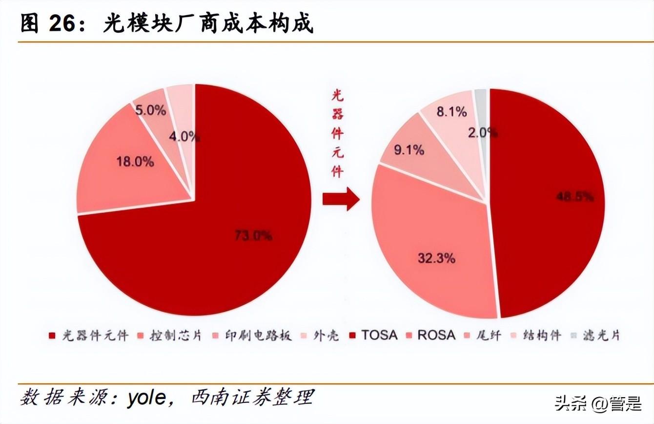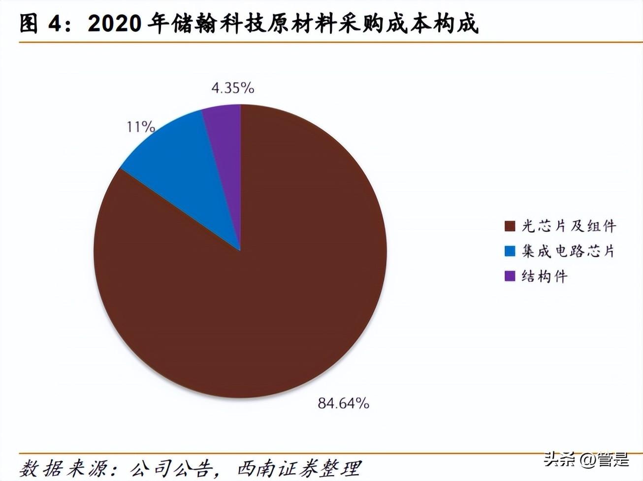 原材料采购中占比最大的为光芯片,其次为电芯片。苏州旭创的原材料采购成本中, 光芯片及组件占比 50%左右,2020 年储翰科技的原材料采购成本中光芯片占比高达 84.6%。 公司采购的光芯片及组件主要包括构成 TOSA、ROSA 的发射器芯片、接收器芯片和隔离 器、透镜、滤光片等组件。集成电路芯片包括驱动芯片、信号处理芯片及相关器件。结构 件包括管壳、同轴零件等。