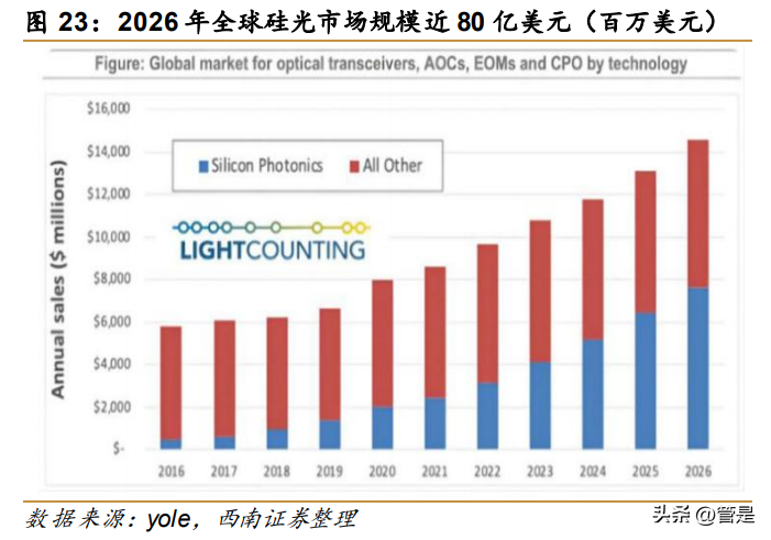 全球硅光市场规模未来 5 年将迅速增长。近年来 5G 下游应用及企业云的快速发展带 动了数据中心从 100G 向 400G 的更迭,硅光模块凭借其高集成度、低成本、高速光传输等 特点,有望成为数据中心网络向 400G 升级过程中的主流产品,其市场份额将加速扩张。 根据 LightCounting 的预测,全球硅光模块市场规模在 2026 年将达到近 80 亿美元,占光 模块市场 50%份额,2021 年至 2026 年硅光模块整体累计规模将接近 300 亿美元。