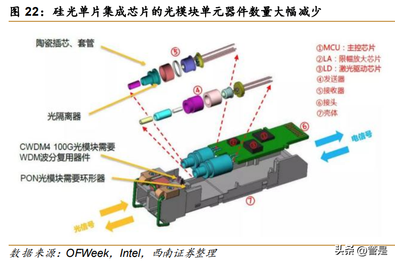 技术:硅光、相干光前景确定,自研布局开辟增长空间。硅光技术速率高、功耗低、结构紧凑,成为行业未来发展趋势。大数据、云计算等新 技术快速发展对光模块的传输速率及容量等提出了更高的要求,硅光技术应运而生。硅光 技术利用硅和硅基衬底材料及现有 CMOS 工艺,进行光器件开发和集成,用光代替电进行 信息传输,被认为是延续摩尔定律的颠覆性技术之一。硅光技术现已融合到高速光模块生 产中,基于硅光技术而生的硅光模块拥有超高速率和超低功耗,尤其适用于数据中心和中 长距离相干通信等场景。