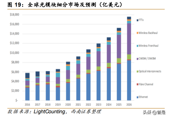 高速光模块是未来光模块行业的主要驱动力。 2021 年,以太网光模块的销售额在 2021 年为 46 亿美元,同比增长 25%,其中 400G 产品销售额增幅较大,800G 产品实现小 批量供货。未来随着 AI、元宇宙等新技术不断发展,以及网络流量长期保持持续增长,以 太网光模块销售额也将保持较快增长并不断迭代升级。根据 LightCounting 的预测,光模块 市场规模将从 2021 年的 80 亿美元增加到 2026 年的 176 亿美元,保持 13.8%的复合增速。