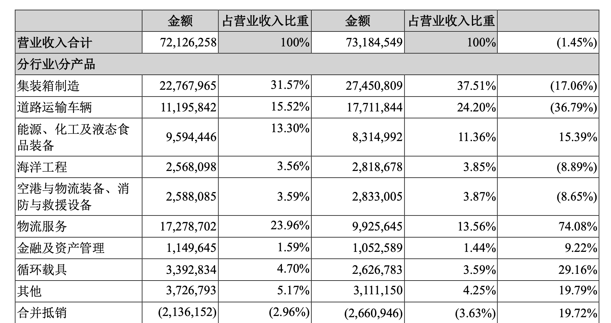 今年上半年,中集集团业务占比排名前三的为集装箱制造业务、物流服务、道路运输车辆业务。营收占比分别为31.57%、23.96%、15.52%。