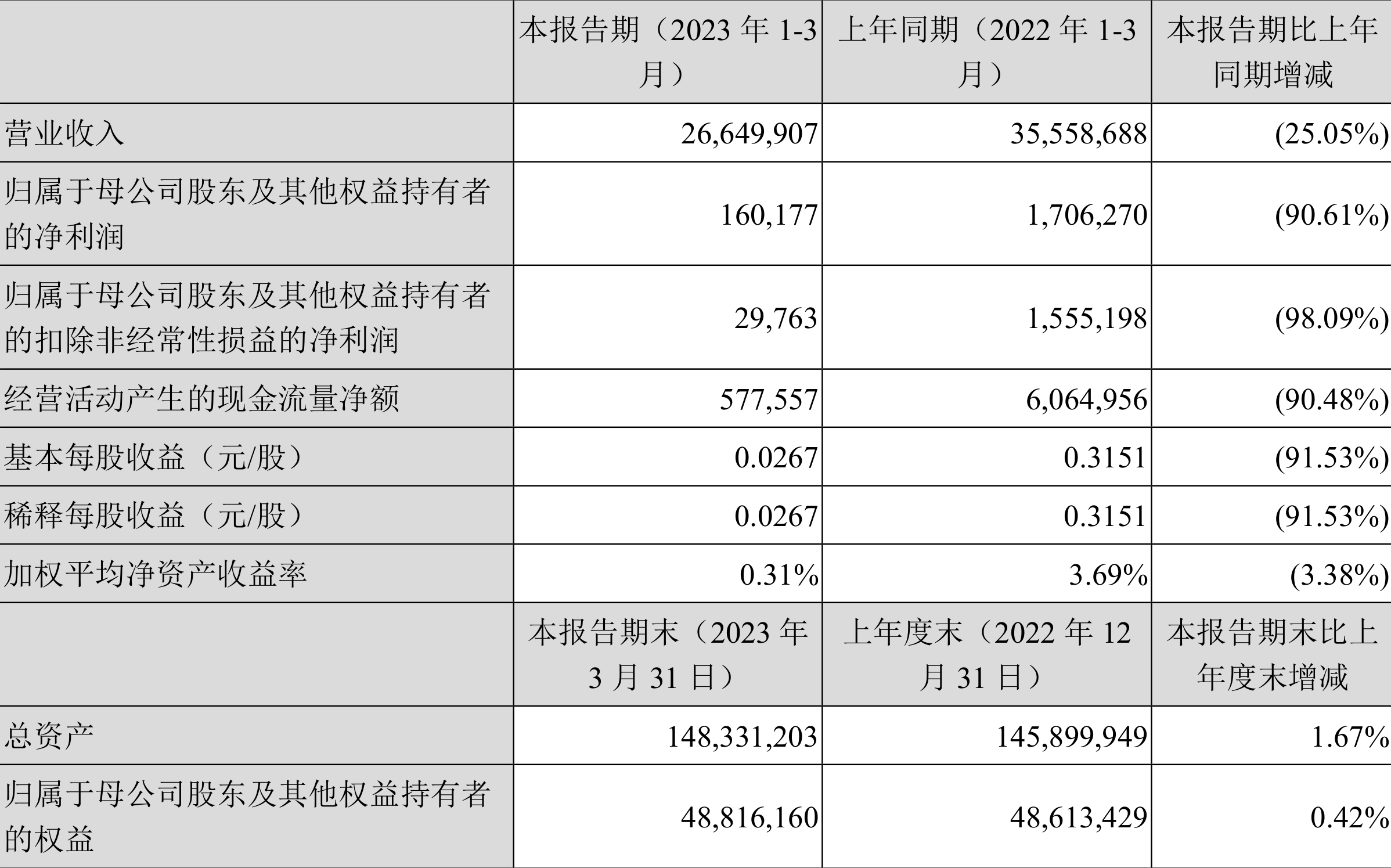 2023年一季度,公司加权平均净资产收益率为0.31%,同比下降3.38个百分点,环比上升0.08个百分点。