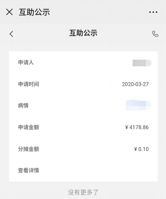 在“中青互联”公众号上显示,截至4月8日,“互助公示”中仅有1名会员接受了互助,金额4100余元。而加入的会员数量已经超过4.6万人,按最低入会门槛100元估算,“互助金”总额达已达数百万元。