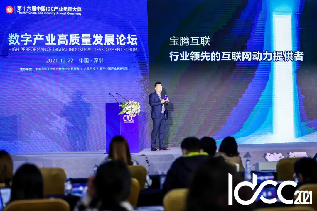 据悉,第十六届中国IDC产业年度大典正在如火如荼的举办中,业界各大行业专家学者、行业爱好者等纷纷奔涌而来。12月22日,深圳中青宝互动网络股份有限公司(SZ.300052)旗下子公司深圳市宝腾互联科技有限公司(简称:宝腾互联)副总经理梁海栋受邀出席“数字产业高质量发展论坛”并发表《数据中心算力赋能数字经济》主题演讲,为大家分享宝腾互联智慧数据中心的创新实践,同时与各行业大拿、专家学者、地方政府、行业爱好者等就推动“数字技术与实体经济的深度交融、激发行业模式创新,加速产业提质增效,实现整个数字产业高质量发展”进行深入交流。