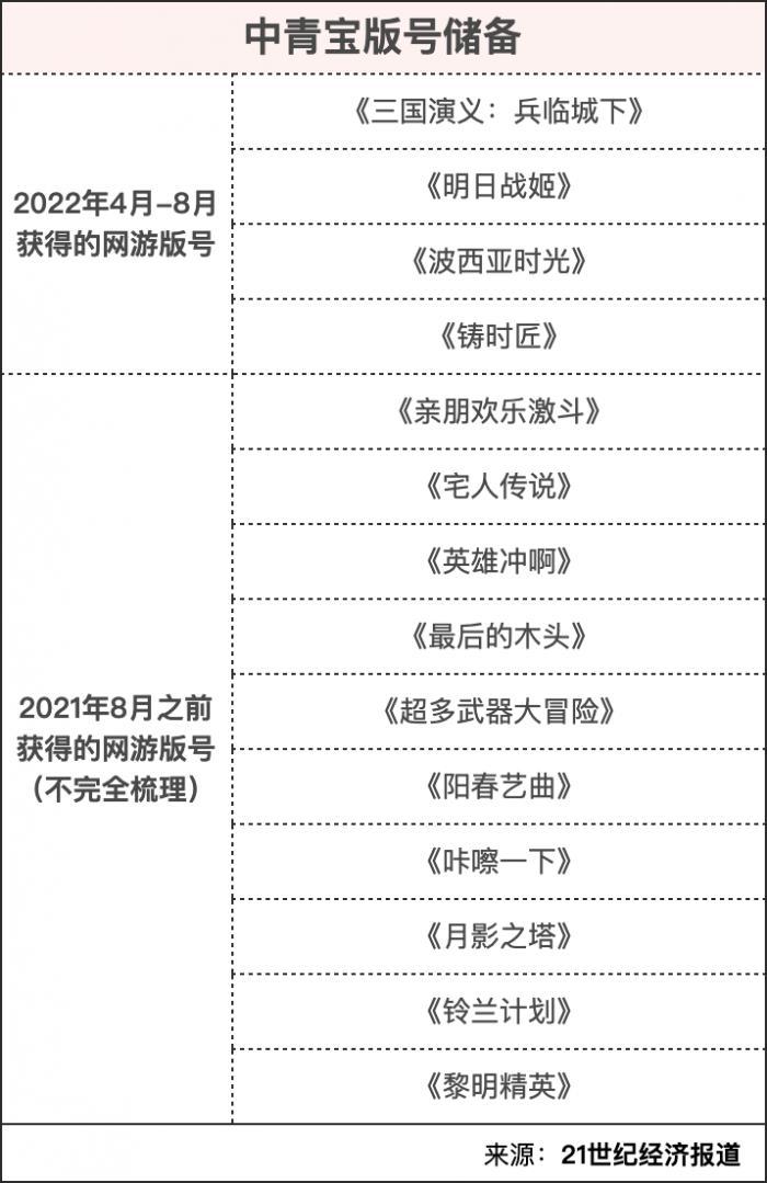 据统计,2022年4月至8月间,中青宝共获得了《三国演义:兵临城下》《明日战姬》《波西亚时光》《铸时匠》4款游戏的版号。而在网游版号暂停发放的2021年8月之前,中青宝旗下则有《亲朋欢乐激斗》《宅人传说》《英雄冲啊》等多款游戏已获得版号。