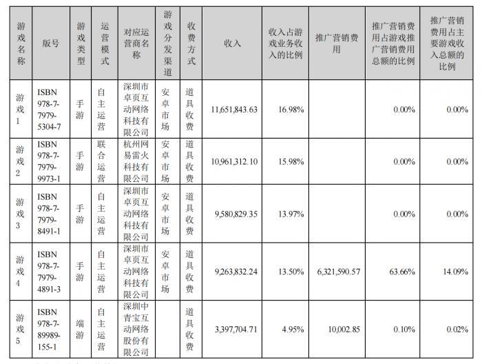 此外,中青宝在财报中披露了5款主要运营游戏的具体收入,其中收入最高的游戏上半年营收约为1165.18万元,占游戏业务收入16.98%的比例。