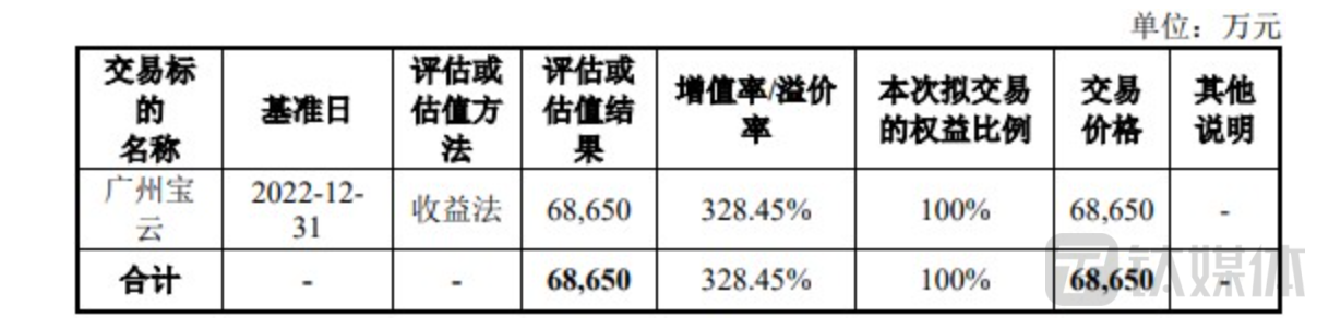 时隔半年,收购价格终于披露。根据北京卓信大华资产评估有限公司出具的评估报告,以2022年12月31日为评估基准日,广州宝云账面净资产1.60亿元。若以资产基础法评估,广州宝云评估价值2.20亿元,增值率37.35%;以收益法评估,评估价值6.87亿元,增值5.26亿元,增值率328.45%。