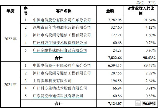 值得注意的是,广州宝云对大客户依赖度极高,其约90%的营业收入来自单一大客户——中国电信广东分公司。2021年-2022年,广州宝云对中国电信广东分公司的销售额分别为6594万元、7283万元,占比分别高达89.49%、91.64%。