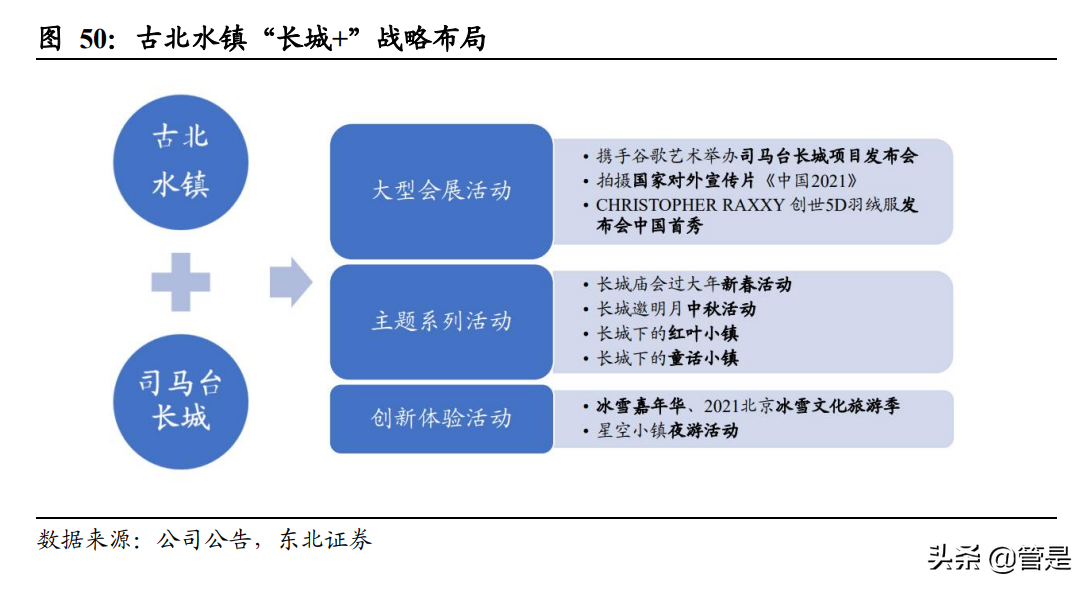 古北水镇深厚的历史文化内涵和山水结合的优质资源为小镇的观光游提供背景支 撑,结合景区体验类服务,形成具有特色的竞争壁垒。古北水镇积极创新营销方式, 疫情期间在原有营销矩阵上加强新媒体融合,举办多场“云游+直播带货”活动,同 时在疫情缓和期针对客源地旅行社召开产品推荐会,为疫后拓展全国旅游市场提前 铺垫。2021 年古北水镇继续秉持“长城+”战略,大型会展活动方面,携手谷歌艺 术与文化举办司马台长城项目发布会,拍摄国家对外宣传片《中国 2021》,2022 年 开年又举办小罐茶百匠百福长城展,助力古北水镇向“会展小镇”品质化升级;主 题活动方面,古北水镇以长城为背景,结合传统节日、季节特征开展了长城庙会过 大年、红叶小镇等系列主题活动,增强游客体验感,构建具有特色的竞争壁垒;创 新体验活动方面,结合“冰雪经济”及“夜游经济”的热度提升,古北水镇积极开 展冰雪嘉年华、星空小镇夜游活动等,也受邀参加 2021 北京冰雪文化旅游季活动, 成功入选第一批国家级夜间文化和旅游消费集聚区,也凭借“冰火交融精彩之旅” 成为京郊冰雪旅游必打卡路线之一。