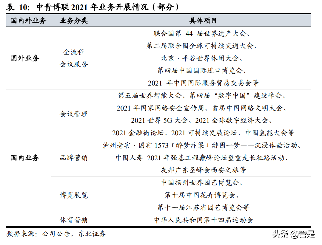 2) 国内业务方面,分项目看,①传统会议管理上,公司深度参与第四届“数字中国” 建设峰会、2021 可持续发展论坛、中国氢能大会等多场高级别行业盛会,为国 内各行业高级别专业会议提供高质量专业服务;②品牌营销上,公司积极突破 创新,成功出品了泸州老窖·国窖 1573「醉梦汴梁」游园一梦——沉浸体验活动、 中国人寿 2021 年强基工程巅峰论坛暨重走长征路活动等全新形式的营销活动 案例,重塑企业品牌营销与企业文化表达新形式;③博览展览上,公司承接了 2021 年中国扬州世界园艺博览会、第十届中国花卉博览会等多场大型博览会项 目,巩固国内博览会运营领域首屈一指的专业地位;④体育营销上,公司助力北 京 2022 年冬奥会、中华人民共和国第十四届运动会的顺利举办,进一步加强了 服务大型体育赛事活动能力,为健康中国战略做出贡献。