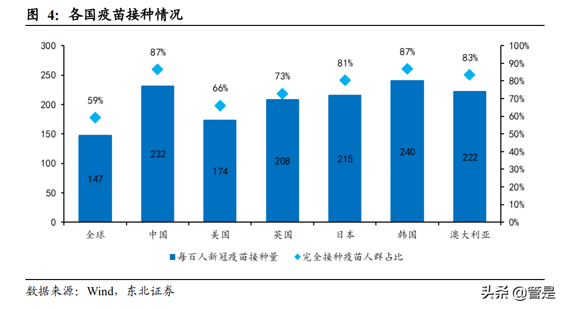 1) 随着新冠疫苗在全国范围内不断普及,全民免疫力得到显著提升,“轻型病例多” 成为近期疫情的主要特点。数据显示,截至 2022 年 5 月 1 日,中国每百人疫苗 接种量 231.65 剂次,平均每人已至少接种两针;国内已完成全程疫苗接种人群 占比也处于世界领先。3 月 15 日晚公布的《新型冠状病毒肺炎诊疗方案(试行 第九版)》提出,各地均反映“奥密克戎变异毒株患者以无症状感染者和轻型病 例为主,大多不需要过多治疗”。因此诊疗方案进一步完善了病例分类收治措施, 轻型病例不再收入定点医院,而是采取集中隔离管理的措施,出院后解除隔离 的标准也由“14 天隔离管理”降低为“7 天居家健康监测”,一定程度上减少了 隔离封控时间,有利于出行自由度的提升。