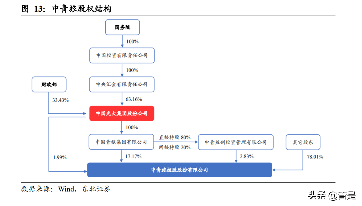 中青旅整体划转光大集团后成为集团大旅游战略的核心承载平台。光大集团作为直 属国务院的部级公司,业务布局横跨金融与实业,拥有光大会展中心、三亚亚龙湾 度假区等可协同文旅资产,具有丰富的资源整合、平台打造经验。2016 年光大集团 同四川省政府签署战略合作框架协议,投资 120 亿开发稻城亚丁景区,以实际行动 证明其打造大旅游平台型生态圈的决心,同时展现了集团强大的旅游资源开发能力。 中青旅的并入更是加快了集团大旅游战略发展的步伐,多机构协同发展,重点布局 景区、旅行社业务,持续发展商务+会展业务,择机扩张酒店业务,充分发挥了光大 集团金融渠道的整合优势和资源共享优势,推进中青旅“旅游+”发展战略。