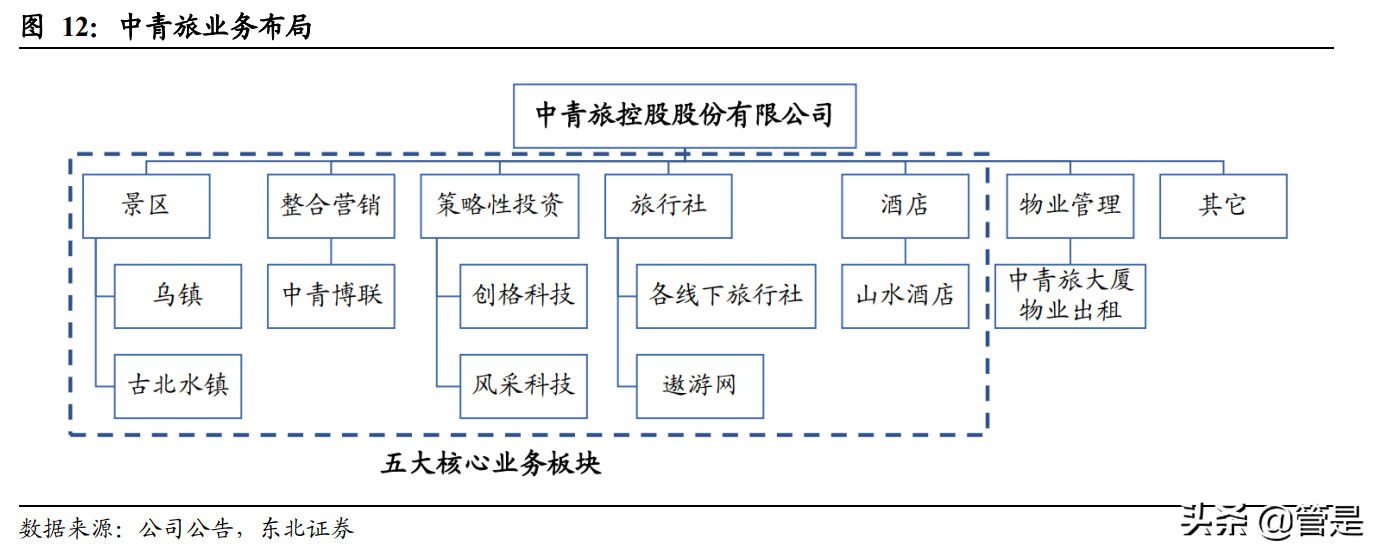 公司广泛布局逐步形成景区、整合营销、策略性投资、旅行社和酒店五大主要板块 相互协同补充的业务格局。公司景区业务以乌镇、古北水镇两大休闲小镇为代表, 通过对景区的开发、经营和管理,将历史文化传承与旅游复合式可开发相结合,定位“综合型目的地”,提供景区内全产业链业务服务,精心打造高品质文化型旅游目 的地;整合营销业务以中青博联为主要平台,提供会议管理、博览展览、体育营销、 文化演艺、线上会展等多板块整合营销综合服务解决方案;策略性投资业务包括创 格科技、风采科技的 IT 硬件代理、系统集成业务、福利彩票技术服务以及中青旅 大厦的物业租赁业务;持续为公司带来稳定的利润贡献,在疫情下为公司业绩提供 了有利支持;旅行社业务以观光旅游、度假旅游、入境旅游、高端旅游为主要内容, 已形成“遨游”、“耀悦”等骨干子品牌;酒店业务由中青旅山水酒店运营,专注于 国内中端精品连锁酒店的投资开发和经营管理,坚持打造文化型、智慧型品牌酒店, 以差异化经营为市场提供特色鲜明的酒店住宿场所及精选服务。