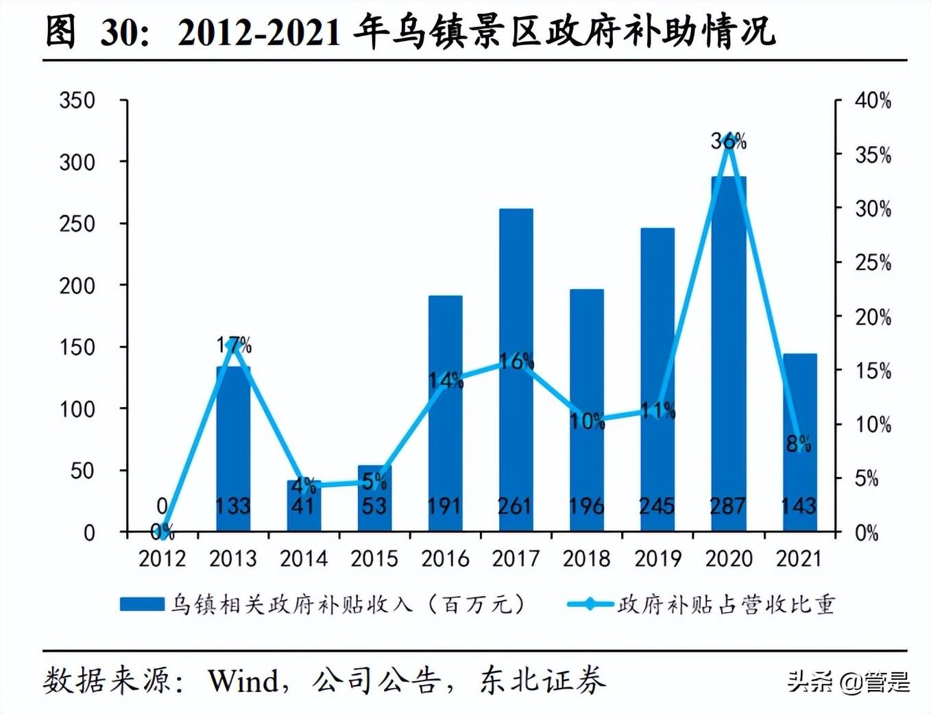由于乌镇开发为当地经济发展做出重要贡献,得到当地政府大力支持,政府补助呈现常态化的趋势,是公司具有一定稳定性的收入补充。公司收到政府发放的补贴主要用于乌镇古镇经营和保护、品牌宣传和推广。疫情前,该部分收入占总收入的比重稳定在 10%左右,且呈现降低趋势,对政府补助的依赖度降低;2020 年受疫情影响,乌镇收到的政府补贴占营业收入比重高达 36%,为乌镇抗击疫情冲击提供了重要支撑力量。