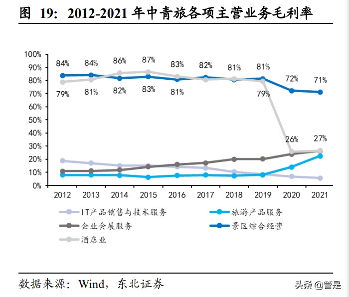疫情后公司多个业务板块受到较为沉重打击,公司收入结构短期发生较大变化。 2020 年在疫情冲击下,旅行社业务收入大幅下降,大额亏损拖累公司盈利能力;景 区运营收入受影响显著,酒店业务的毛利率呈现大幅下降。疫情对除 IT 产品销售 以外业务均产生较大冲击,IT 产品销售收入不降反增,在疫情中为公司收入提供了 重要支撑,一定程度上平滑了冲击。2021 年公司五大核心板块除旅行社和 IT 业务 全部实现营收的正增长,IT 业务虽小幅下降但总体稳定,继续为公司带来稳定的利 润贡献,此外有房产销售收入显著增加,成为利润重要补充。2021 年公司实现营收 86.35 亿元/同比+20.76%/恢复至 2019 年的 61.4%,分业务看,IT 产品销售与技术服 务/整合营销/旅游产品服务/景区经营/酒店/房屋租赁/房地产销售业务分别实现营收 41.34 亿元/17.32 亿元/5.04 亿元/8.64 亿元/3.49 亿元/1.9 亿元/8.62 亿元,同比分别0.07%/+47.48%/-15.42%/+13.74/+16.96%/+5.57%/+18127.06%,恢复至 2019 年的 107.4%/64.82%/10.69%/49.16%/64.2%/209.29%/204.45% , 业 务 占 比 分 别 为 47.87%/20.05%/5.84%/10%/4.04%/2.2%/9.98%。