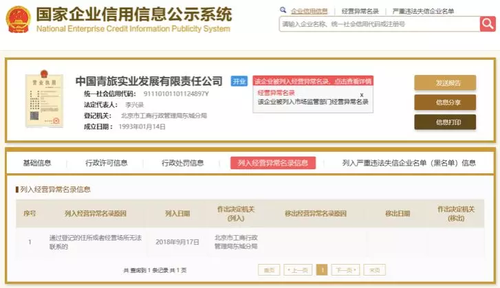 据天眼查,截至目前,中青旅实业共关联22则失信被执行人信息,北京黄金关联17条失信被执行人信息。2018年9月因通过登记的住所或经营场所无法联系,中青旅实业被列入经营异常名录,至今仍未被移出。