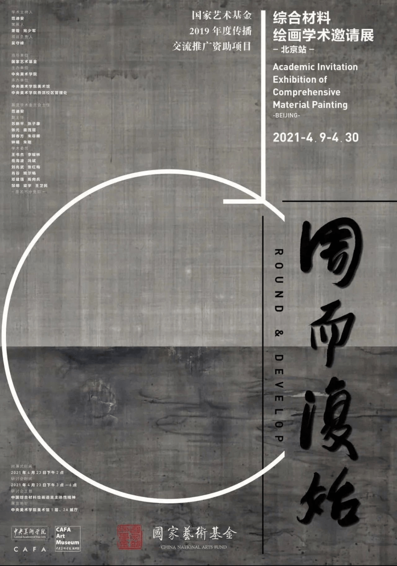 From mid-2019 to 2021, some of the selected works of " Round & Develop -Mixed Material Painting Academic Invitation Exhibition Collection" have been exhibited at the Art Museum of Jilin University of Art, Shanghai Marley Art Museum, Shanghai Institute of Visual Arts Art Museum, Chongqing Art Museum, Shenzhen University Art Museum, Liaohe Art Museum, Jinan Art Museum, Xi'an Academy of Fine Arts Art Museum and other places, and will be exhibited at the ninth station of this project at CAFA Art Museum from April 9 to April 30, 2021. On the afternoon of April 23, 2021, the closing ceremony, and the academic seminar on " Round & Develop -linguistic Subjectivity of Chinese Comprehensive Materials" were held. The academic chair of this project is Fan Di'an, president of the Central Academy of Fine Arts and chairman of the China Artists Association, and the project literature collection is compiled by Wu Shoufeng, the project leader, and Xiao Huang, curator.
