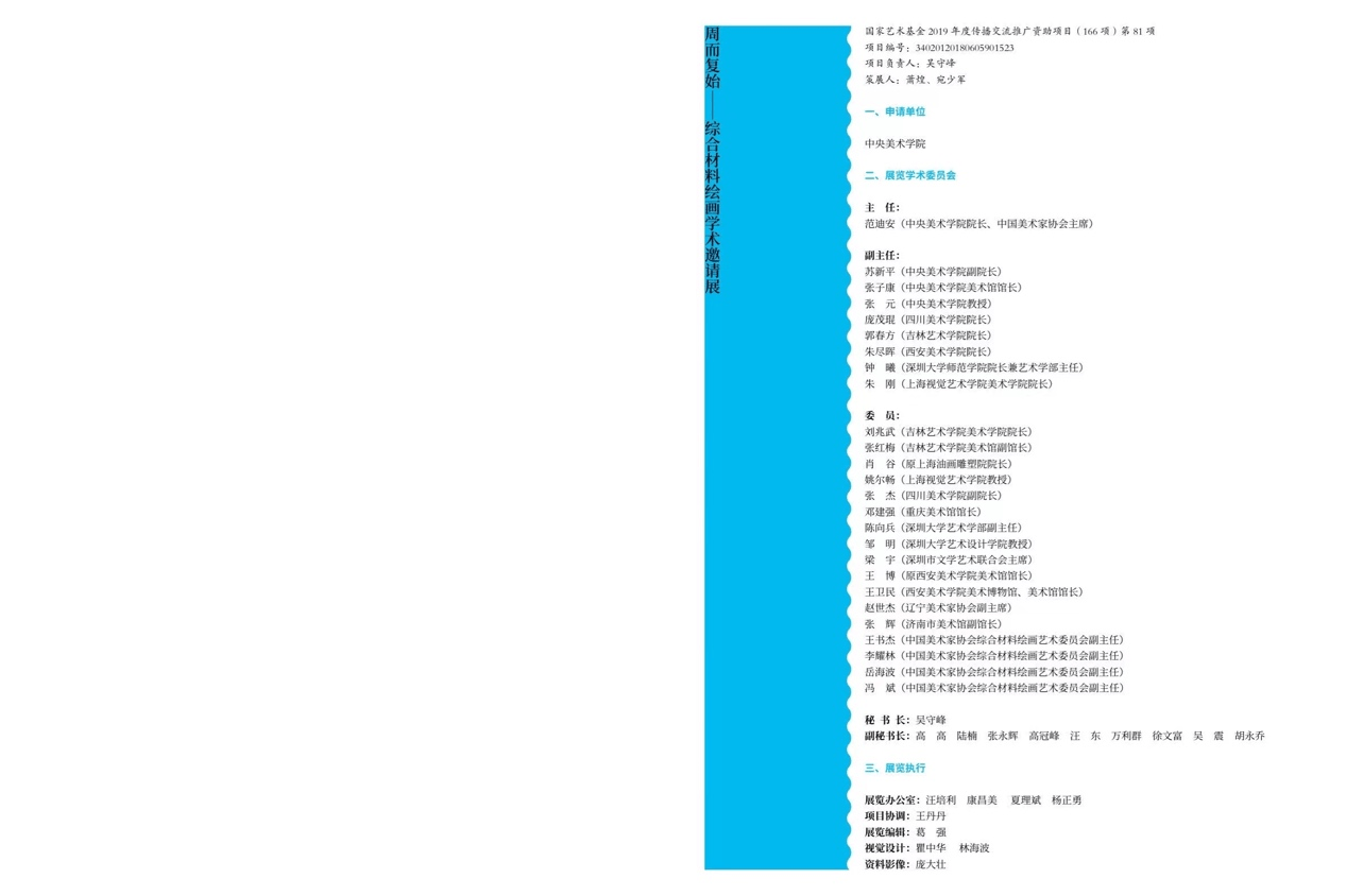 此次展览和文献集的呈现,集结了以中央美术学院为首的业内专家们的创作成果,较为全面地体现了国内艺术家们在综合材料绘画上的最新探索与思考表达,既展现了我国高等美术教育多年来在本学科的教研成果,同时也回应了在时代新语境下关于综合材料绘画的发展要求。《周面复始--综合材料绘画学术邀请展》、《周而复始-综合材料绘画学术邀请展文献集》既是高校之间高品质的学术交流活动。也是借助国家艺术基金的力量,结合社会各界精英、以学术为本源,打造传播交流与推广平台建构时代新文化发展体系。探索中国特色架上艺术的自新之路。