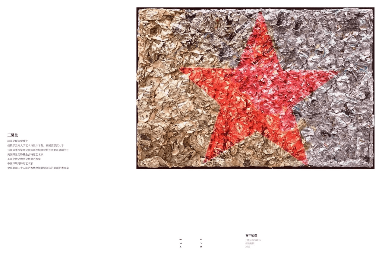 近日,由国家艺术基金传播推广资助项目、中央美术学院主办的《周面复始--综合材料绘画学术邀请展》即将结集出版《周而复始-综合材料绘画学术邀请展文献集》,国际生态环保艺术家王馨曼受邀入选此项目和文献集。王馨曼入选作品名称《百年征途》,综合材料,尺寸120cm * 180cm,创作时间2019年。