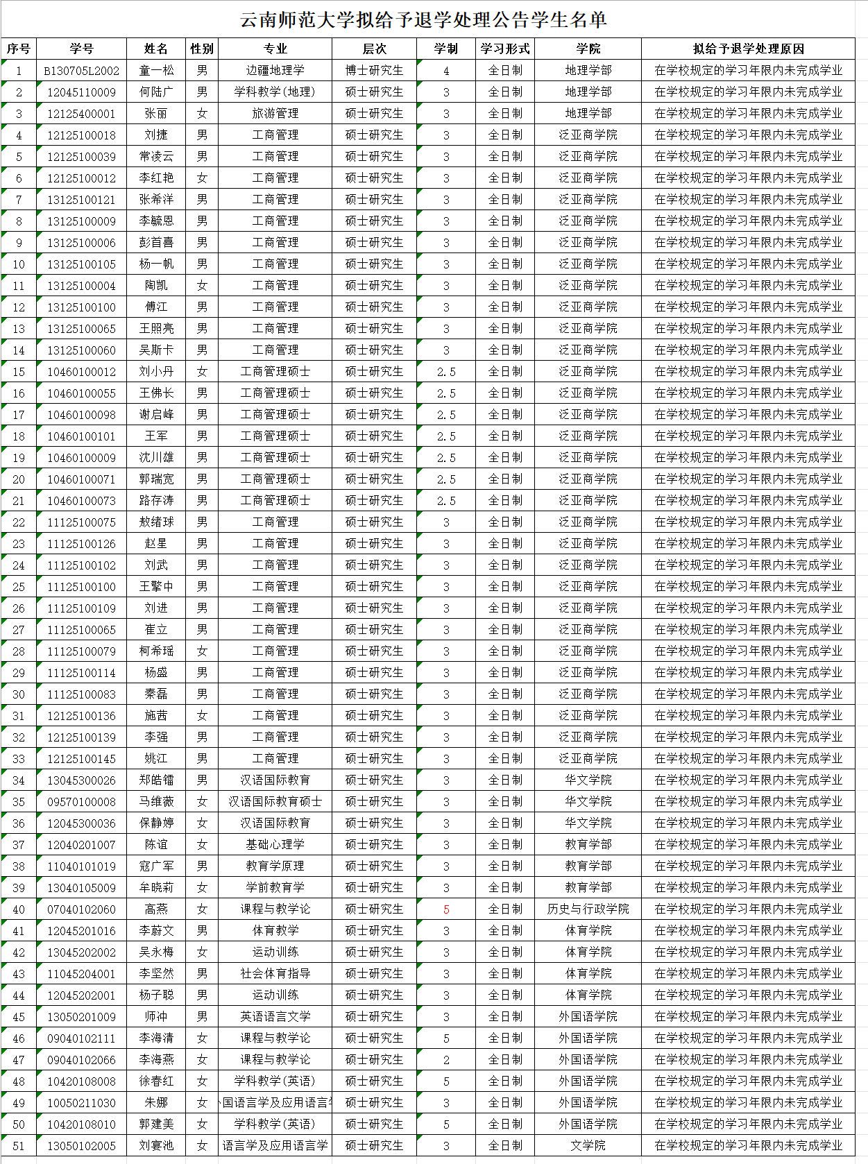 据云南师范大学研究生院网站12月21日消息,云南师范大学研究生院当天发布《拟给予童一松等51人退学处理的公告》称,经研究,拟对在规定学习年限内未完成学业的童一松等51名学生给予退学处理,并印发《云南师范大学退学处理告知书》。