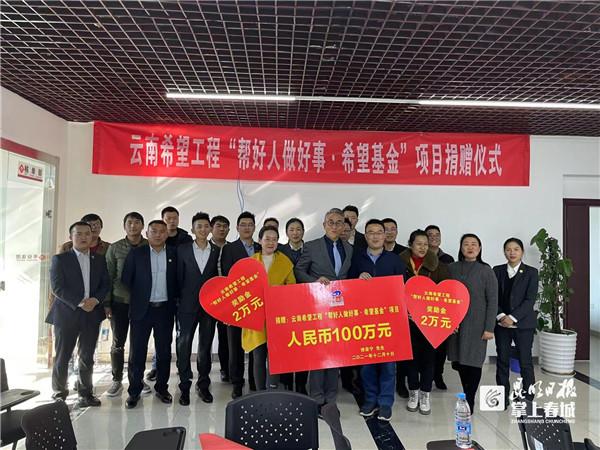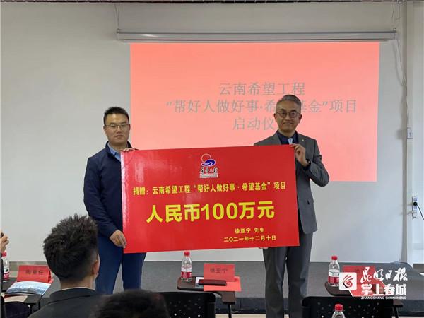 12月10日,云南希望工程“帮好人做好事·希望基金”捐赠仪式在昆举行,该公益项目由爱心人士徐亚宁在云南省青少年发展基金会设立,首批注入基金100万元,将助力云南省公益事业发展。