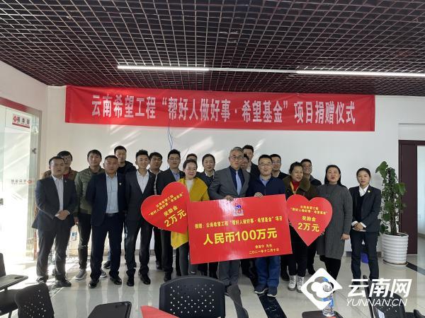12月10日,云南希望工程“帮好人做好事•希望基金”项目捐赠仪式在昆举行。首批捐赠资金100万元,将用于关注社会弱势群体,以及在敬老爱老、助医助困、助学助教、帮扶困境儿童、改善生态环境及见义勇为等方面有爱心善举的人士,给予每人2万元和100万医疗意外险的激励,以此褒奖善举之人,弘扬中华民族传统美德。