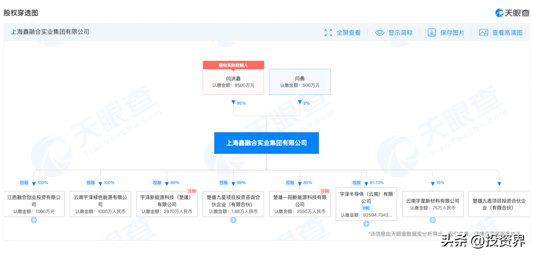 资料显示,宇泽半导体成立于2019年,公司第一大股东为持股61.73%的上海鑫融合实业集团有限公司,而后者的股东仅有两人,分别是持股95%的闫洪嘉和持股5%的闫勇。