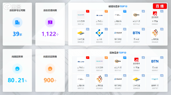 据线上数据统计,截至5月11日上午12点,投资者在本次活动共提问1122个,上市公司问题总回复数量为900个,问题回复率达到80.21%。其中,稳定股价、提升盈利能力等市值管理相关问题成为投资者提问较多的领域。