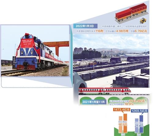 2022年1月3日,中老铁路开通运营“满月”,经昆明海关监管验放的中老国际货物列车共116列、总货运量达4.98万吨、货值6.76亿元。