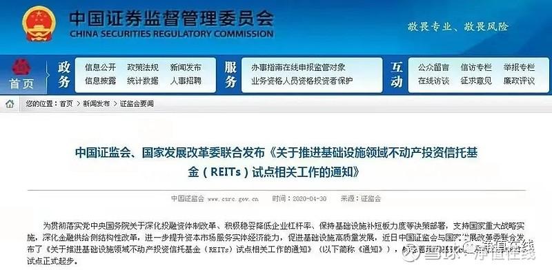 2020年4月30日,证监会和国家发改委联合发布《关于推进基础设施领域不动产投资信托基金(REITs)试点相关工作的通知》,