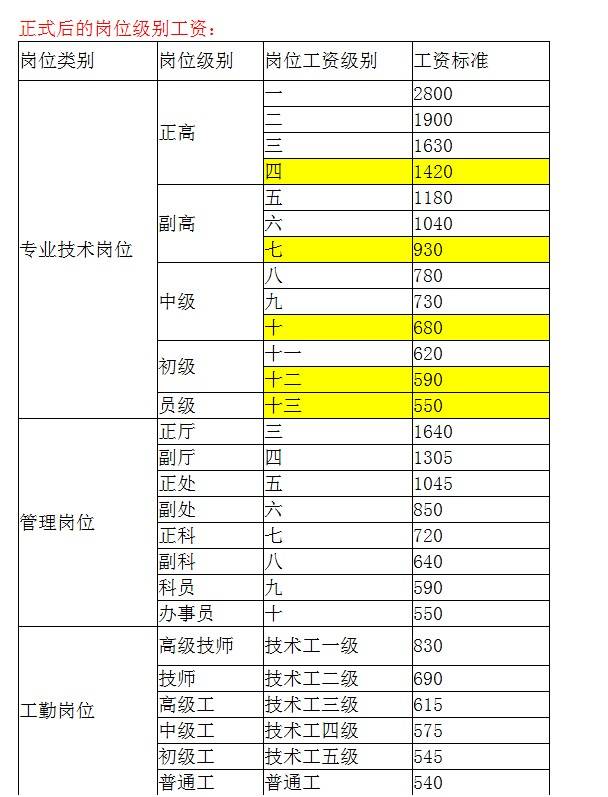 级别划分表及基本工资