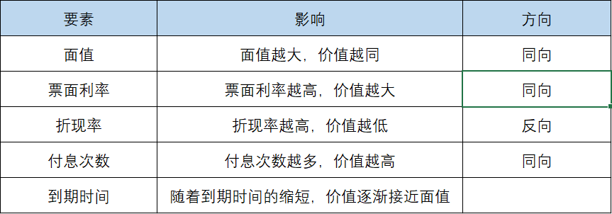 债券价值的要素对于债券价值高低有不同的影响,在其他条件不变的情况下,单一要素变动对债券价值影响如下图: