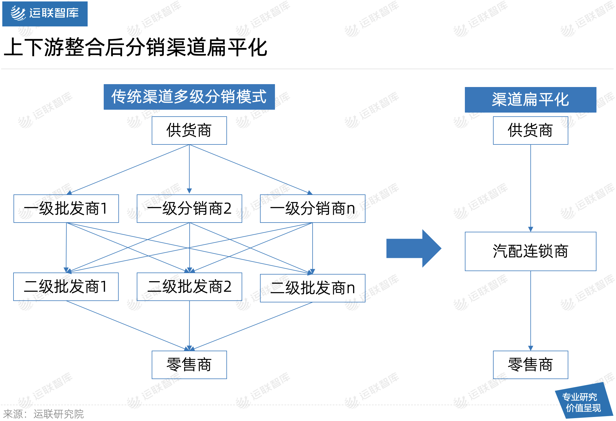 随着美国四大汽配连锁商的市场规模不断扩大,传统的经销商体系逐渐被打破,四大汽配连锁商占据了汽配产业链的核心位置。一方面,掌握了话语权的汽配连锁商逐步向汽车零部件上游发展,整合上游的生产商;另一方面,汽车零配件连锁商的规模扩大之后,通过集中采购,将下游的零散需求整合起来;从而促进了汽车零配件渠道扁平化发展,没有层层分销。