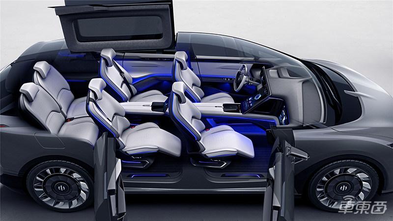 首先,其搭载了6个车门,除了常见的左前、左后、右前、右后之外,其后排顶部还一个类似特斯拉Model X的蝶翼门,可以向上张开,从而让后排乘客进出车内更加方便。