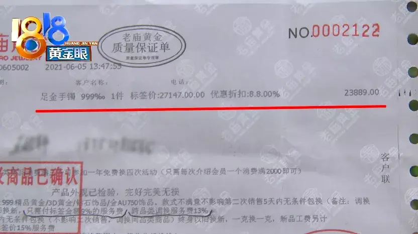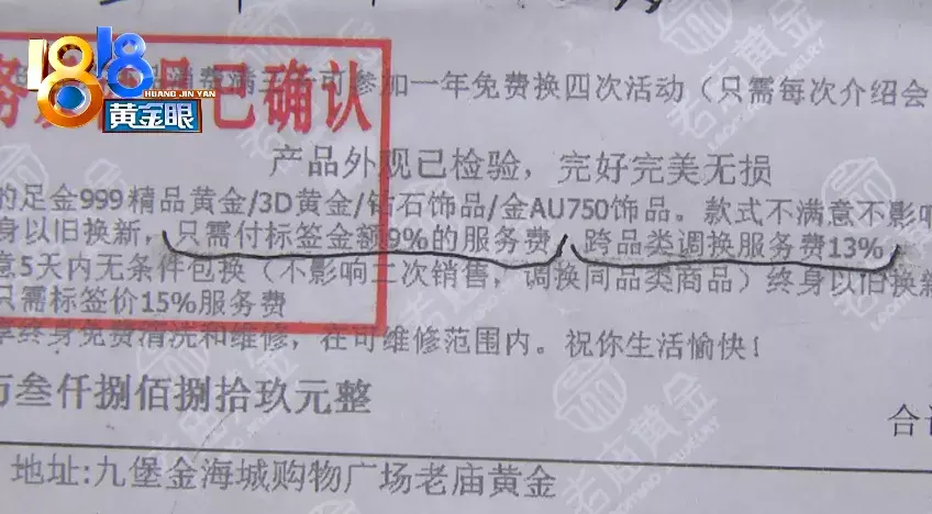 李女士付钱时,销售在单据上用笔划了这两句话:“以旧换新,只需要付标签金额9%的服务费,跨品类调换服务费13%”。王经理表示,李女士如果要换以克重加加工费计算的金手镯,要支付标签价的13%,也就是