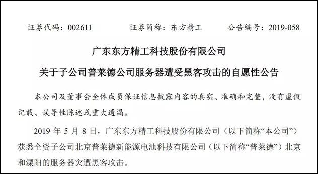 5月8日晚间,东方精工公告称,公司获悉,全资子公司北京普莱德新能源电池科技有限公司(以下简称普莱德)在北京、溧阳的服务器,突遭黑客攻击。