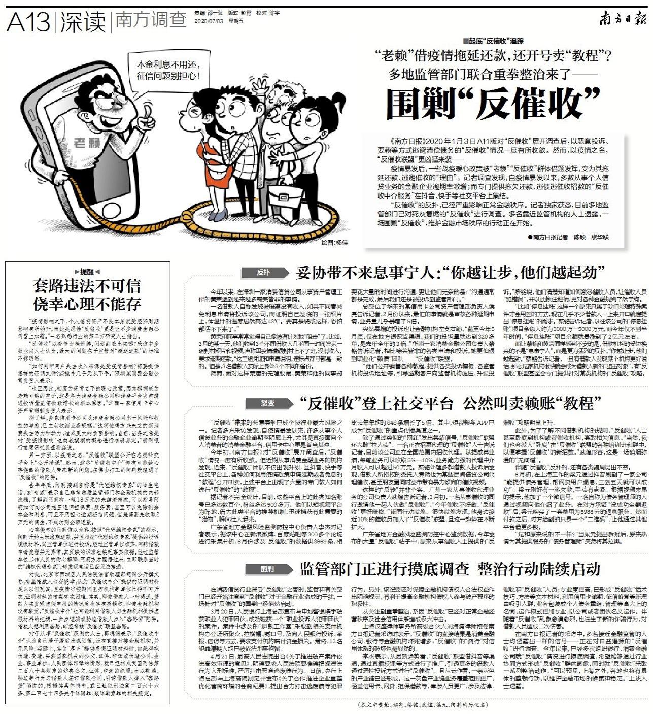 《南方日报》2020年1月3日A11版对“反催收”展开调查后,以恶意投诉、耍赖等方式逃避清偿债务的“反催收”情况一度有所收敛>>>起底“反催收”江湖。然而,以疫情之名,“反催收联盟”更凶猛来袭——