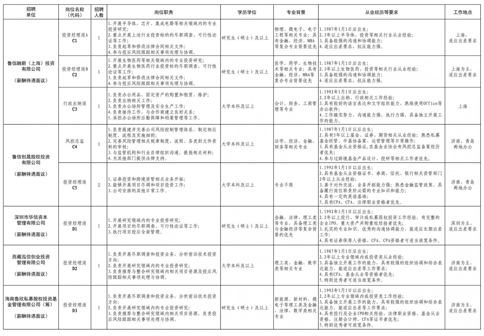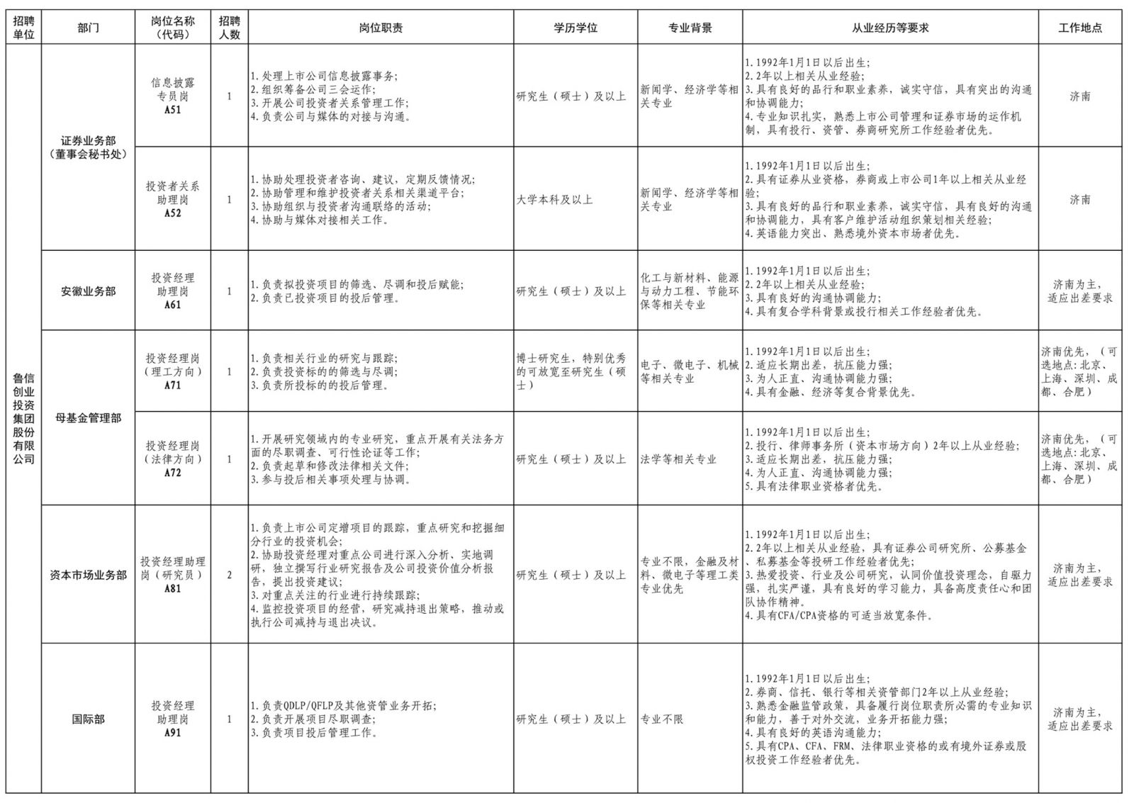 鲁信创业投资集团股份有限公司本部岗位(代码A11-A91)接收邮箱:lxct@luxin.cn;