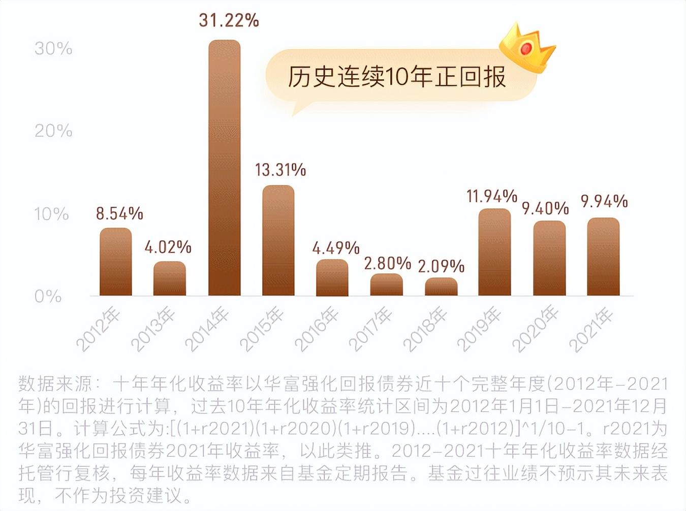 他管理(2014.3.6起)的华富强化回报债券(LOF)十年多以来年年获得正收益,同时十年年化达9.5%。