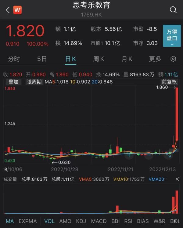 12月13日,港股思考乐教育尾盘突然飙升,最大涨幅超过104%。截至收盘,其股价报1.82港元/股,涨幅为100%,总市值10.1亿港元。