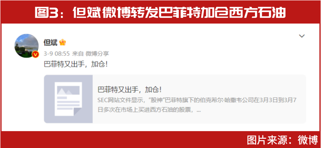 但斌微博最近转载发布的多条内容均与石油有关。如3月9日,但斌微博转载发布了有关巴菲特出手加仓西方石油的相关内容(见图3)。