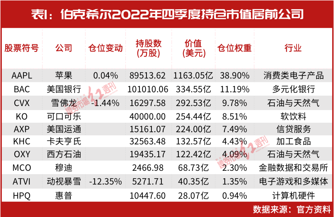 值得一提的是,这是巴菲特自去年三季度之后首度再次加码西方石油。据伯克希尔此前不久披露的2022年四季度持仓显示,西方石油为第七大重仓股,持有数量为19435万股,与三季度相比,未发生变化(见表1)。