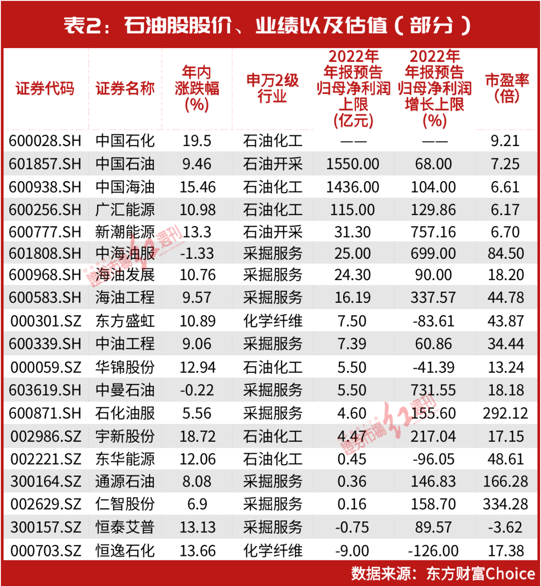 同样受益于油价上涨等因素影响,不少石油股交出了一份不俗的2022年业绩成绩单。如中国石油、中国海油、广汇能源,预计实现母公司净利润上限分别为1550亿元、1436亿元与115亿元,分别同比预增68%、104%与129.86%。而与此同时,其估值水平仍处于相对低位,如中国石油为7倍(TTM)左右,中国海油、广汇能源均为6倍(见表2)。