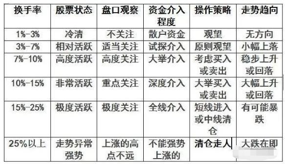 一般来讲,换手率较高的股票,往往也是短线资金追逐的对象,投机性较强,股价起伏较大,风险也相对较大。以下是一个日换手率的参考数据表: