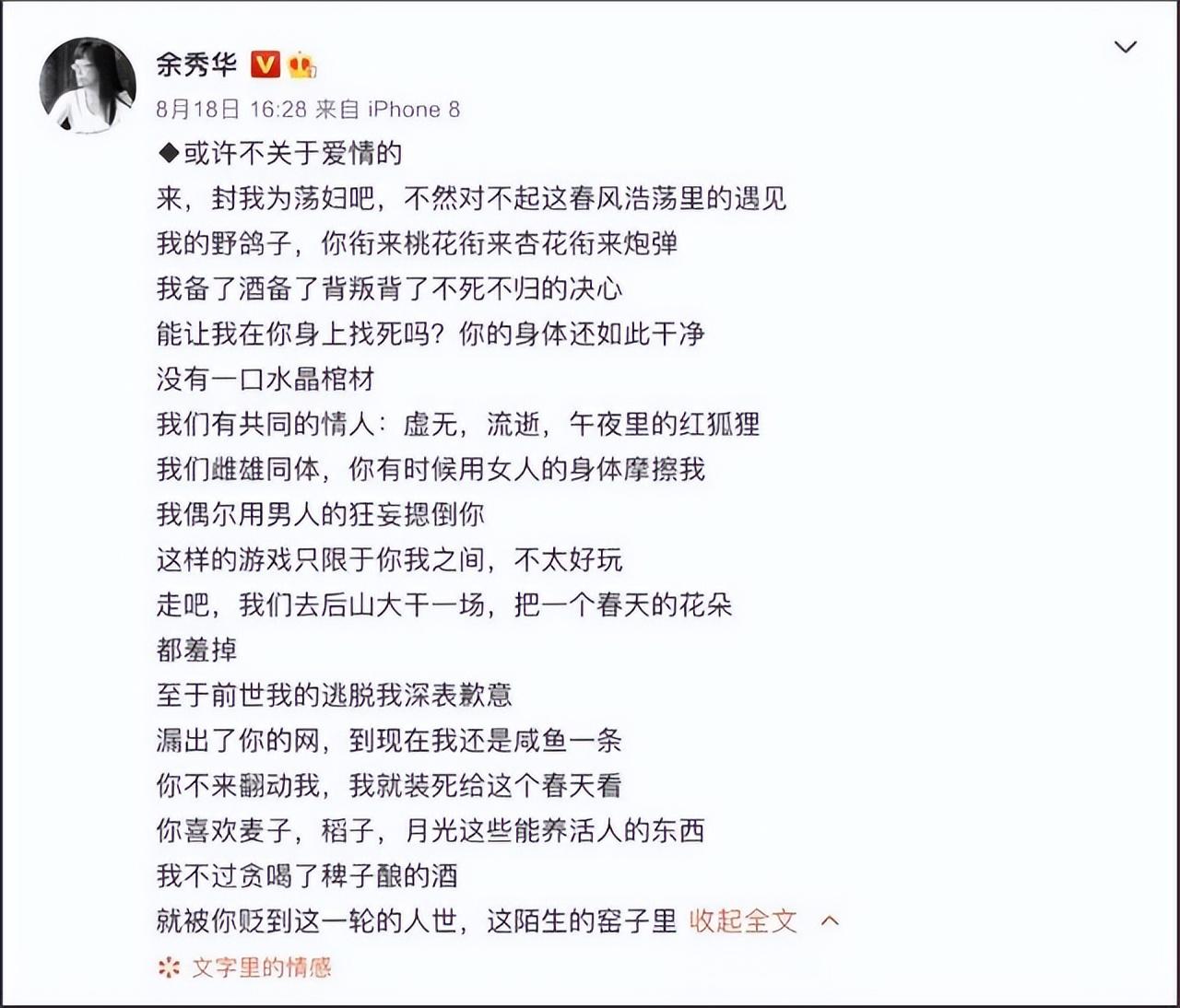 但是余秀华并未销声匿迹,偶尔写写小诗陶冶一下情操,偶尔在网上与“黑粉”针锋相对,偶尔为她所想的进行发声。
