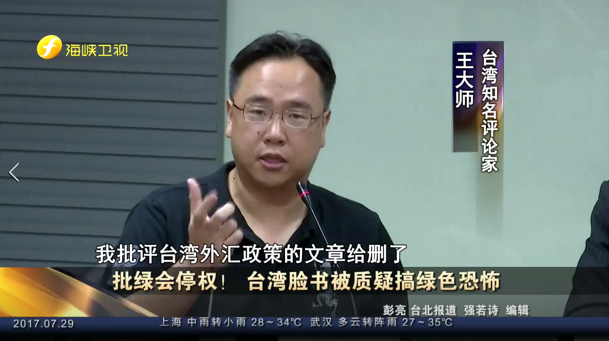 有相同经历的还有台湾知名评论家王大师,他曾因一篇质疑蔡当局花大钱购买美国武器的贴文遭到脸书封锁,前两天又有一篇批评当局的文章也遇到了删除。