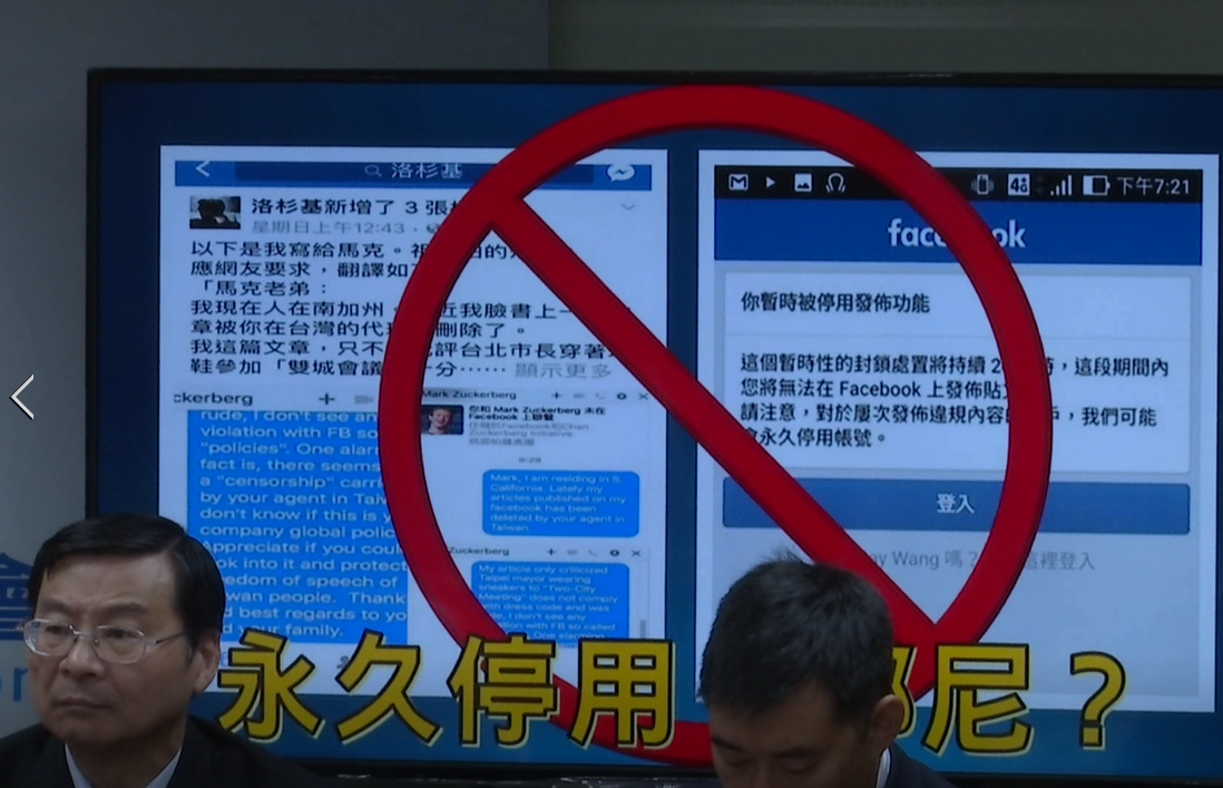 她更举例说,她曾因为李登辉说钓鱼台是日本的,她写了一篇脸书文质疑批评。这一篇,脸书非常干脆,直接把它下架。文章发出后一小时被下架,她以为是自己眼花或电脑宕机,还好备份了,就重新发,结果两分钟之内,重发的文章又不见了,她还被警告,如果再继续PO类似文章将被停权。另一次,高雄拍到陈水扁的面包师向她求援。她写了一篇关于陈水扁与面包师的短文。结果她的脸书立刻被停权。被封锁。因为不是第一次,也不是第二次,第三次被封了。只有等待哪一天它心情好了,给恢复过来。而
