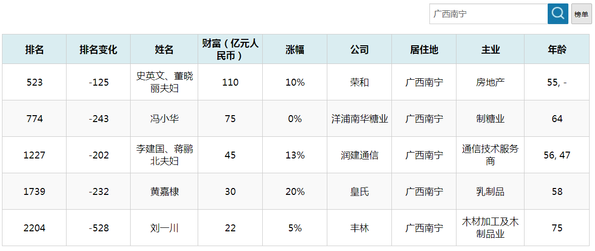 值得一提的是,在近期胡润研究院发布的《2020衡昌烧坊·胡润百富榜》中,小编按照搜索地区输入“南宁”。发现居住在广西南宁的亿万富豪有5人上榜,分别是荣和的史英文、董晓丽夫妇(110亿排名523位);洋浦南华糖业的冯小华(75亿排名第774位);润建通信的李建国、蒋鹂北夫妇(45亿排名第1227位);皇氏的黄嘉棣(30亿排名第1739位);丰林的刘一川(22亿排名第2204位)等财富共计282亿元。其中史英文、董晓丽夫妇,冯小华,李建国、蒋鹂北夫妇等位列前三甲,财富共计230亿元,格外抢眼。大家更看好谁的未来发展潜力?
